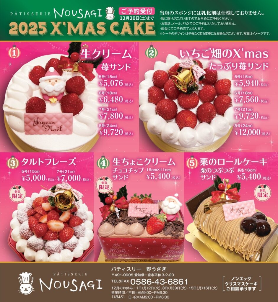 今月は、1年に一度の特別な日を彩る、パティスリー野うさぎの2025年クリスマスケーキをご紹介いたします。